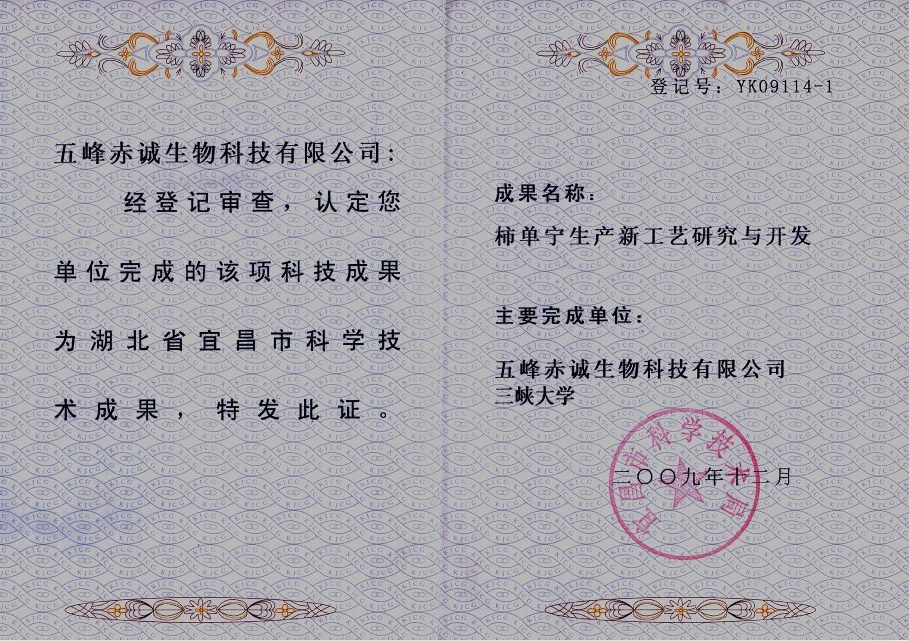 Result EK100782-3 2010.9 Scientific and technological achievements Registration certificate (Persimmon tannin)