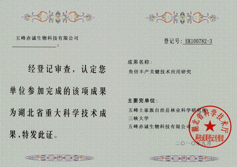 Result YK09114-1 2009.12 Certificate of scientific and technological achievements (Horned gall)